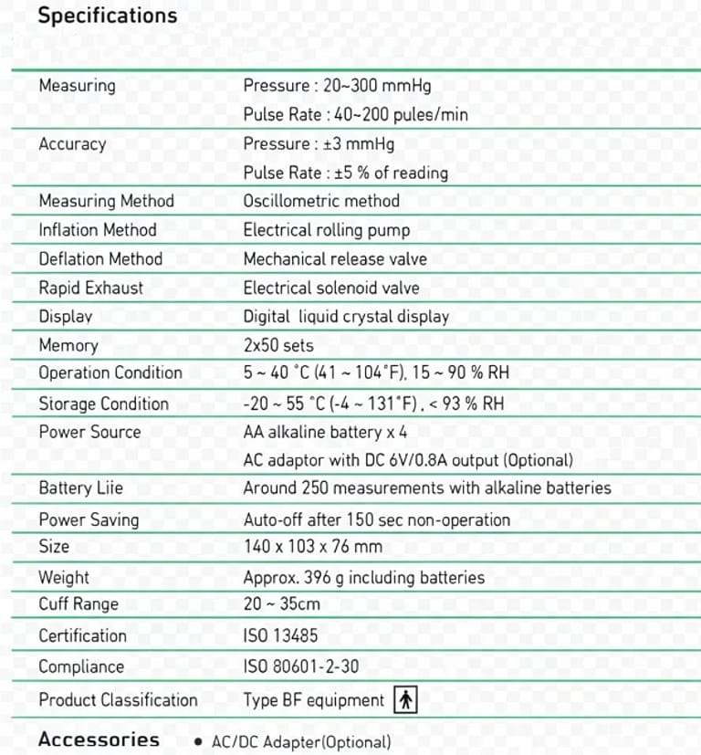Irregular Heartbeat DetectionAdvanced sensor technology detects irregular heartbeats during measurement. | Long Battery LifePowered by batteries or optional AC adapter for reliable operation whenever you need it. |